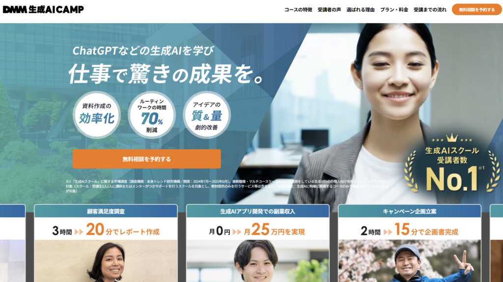 | スクール名 | DMM 生成AI CAMP(生成AI基礎マスター/マーケ・営業・人事向けコース/生成AIエンジニアコース/Difyマスターコース など) |