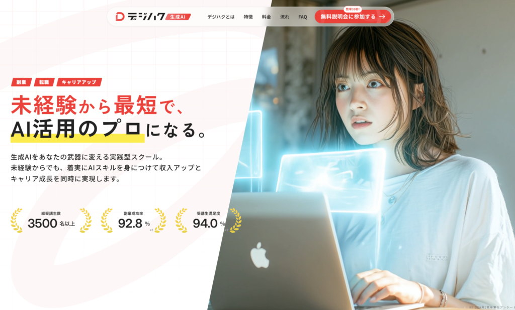 | 無料講座の有無 | 無料カウンセリング・無料説明会あり(Zoomで個別相談)。生成AI活用の体験デモやカリキュラム紹介を実施 |