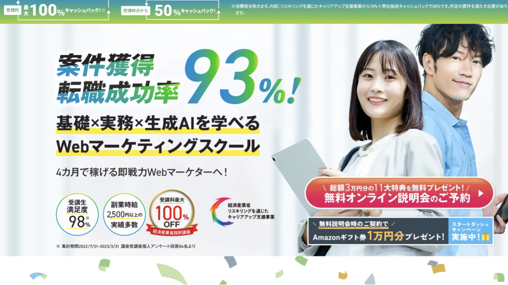 | 学べる内容 | 生成AI×コンテンツマーケティング(記事・提案書・資料作成)、生成AI×LP最適化、生成AI×Meta・リスティング広告運用、生成AI×ペルソナ・カスタマージャーニー作成、SEO対策・アクセス解析、プロンプトエンジニアリングを活用したマーケティング業務効率化 |