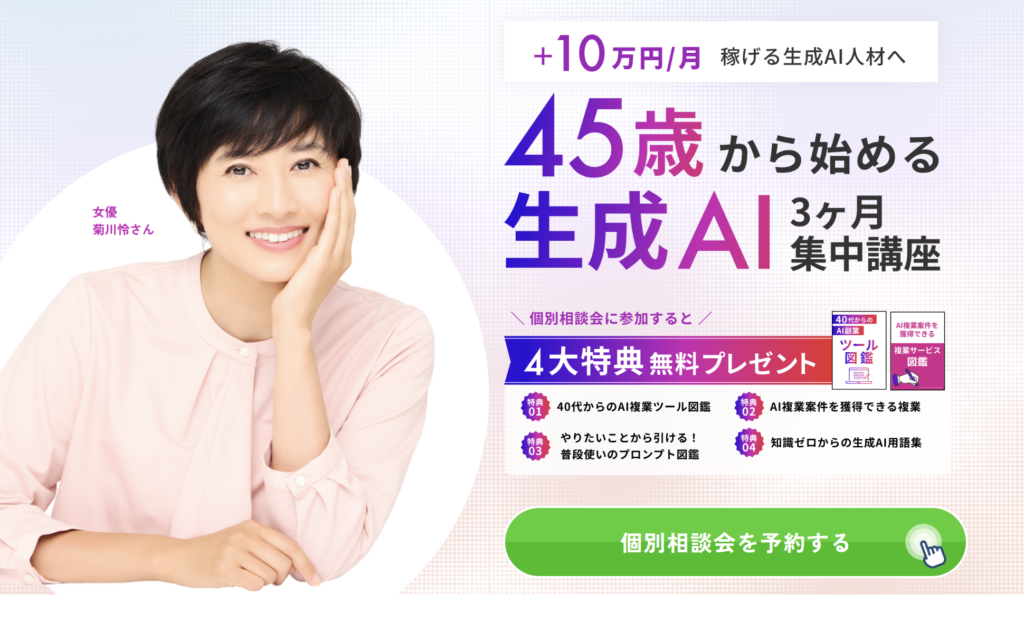 | 学べる内容 | 生成AI基礎(ChatGPT活用・プロンプト設計)、画像・イラスト生成、動画コンテンツ制作、文章作成・文字起こし・翻訳、業務効率化(議事録・スライド)、AIコンサル視点、副業案件獲得(ライティング・データ分析・クリエイティブ代行) |