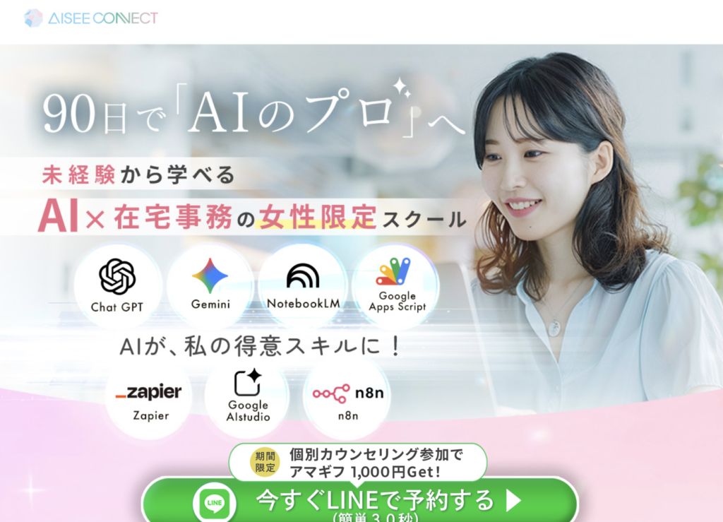 | スクール名 | AISEE(アイシー)AI事務スクール(バックオフィス業務×生成AI特化) |