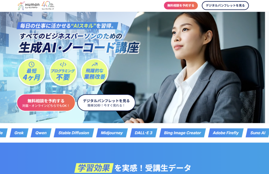 | スクール名 | ヒューマンアカデミー 生成AI講座/生成AI・ノーコード講座/生成AI活用講座(eラーニング含む) |
