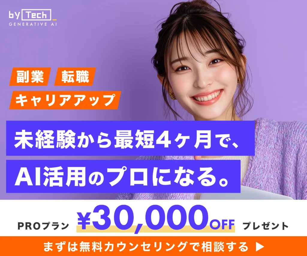byTechの最大の特徴は、単なるツールの使い方ではなく、「ビジネス課題をAIでどう解決するか」というコンサルティング視点を養える点にあります。単なる知識の習得にとどまらず、受講生自身の実際の業務をAIで自動化・効率化させる「実案件化」を重視したカリキュラムが非常にユニークです。