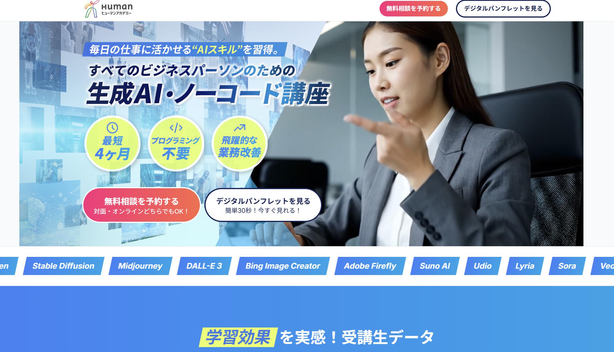 ヒューマンアカデミーの生成AI・ノーコード講座は、プログラミング知識ゼロのビジネスパーソンが「AIを使いこなす側」に回るための、信頼性と実践性を兼ね備えた選択肢です。