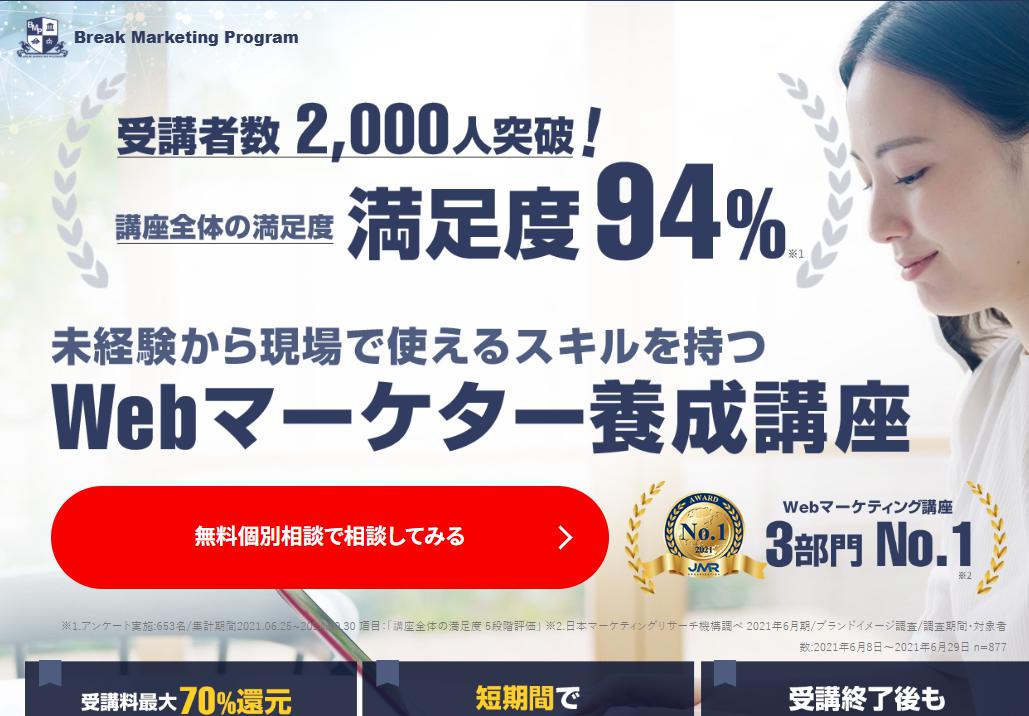 未経験からWebマーケターを目指す方必見!Break Marketing Program(BMP)の評判・口コミを現役マーケターが徹底解説。実践的なカリキュラムや手厚いサポート体制、補助金制度まで詳しく紹介します。