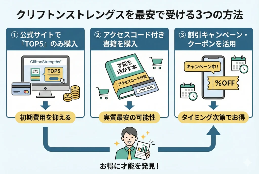 クリフトンストレングスを最も安く受ける方法は、対象書籍を新品で購入することです。書籍の巻末にはトップ5の資質がわかるアクセスコードが付属しており、書籍代だけで診断を受けられます。
