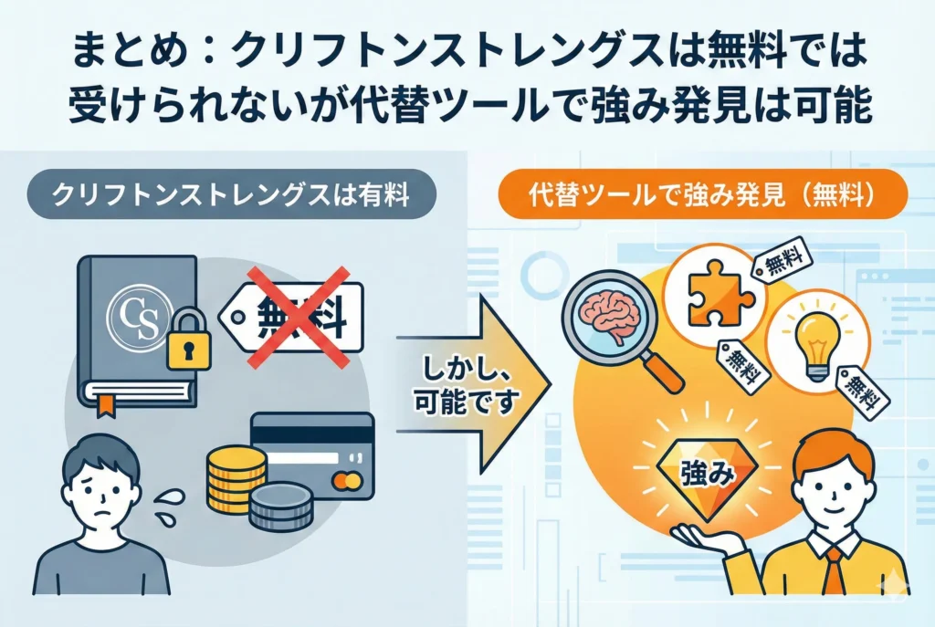 まとめ:クリフトンストレングスは無料では受けられないが代替ツールで強み発見は可能