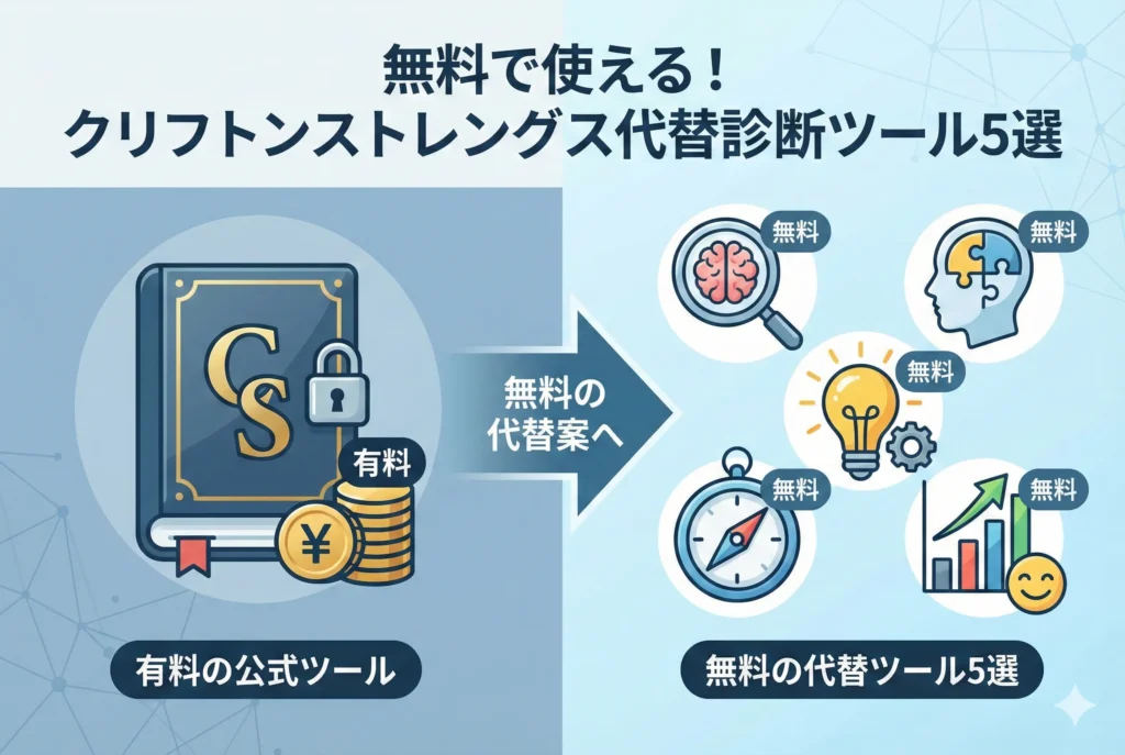 「クリフトンストレングスを無料で受けたい」と考えていませんか?結論から言うと、ギャラップ社公式の無料版は存在しません。しかし、書籍購入で費用を抑える方法や、無料で使える代替診断ツールもあります。本記事では、クリフトンストレングスの料金プランや最安で受ける方法、おすすめの無料代替ツールを紹介します。