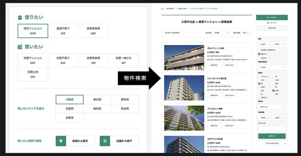 GRAVITYで構築できるのは、物件検索機能を備えた不動産ポータルサイトです。賃貸・売買の両方に対応しており、以下のような物件種別ページを作成できます。