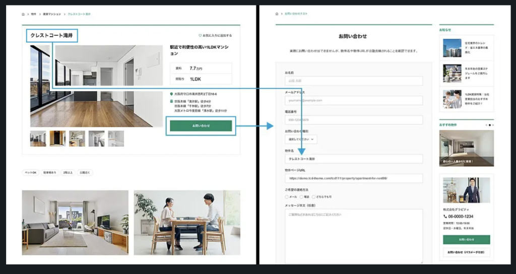 - 問い合わせ自動連携:物件ページから問い合わせフォームに遷移すると、物件名とURLが自動入力