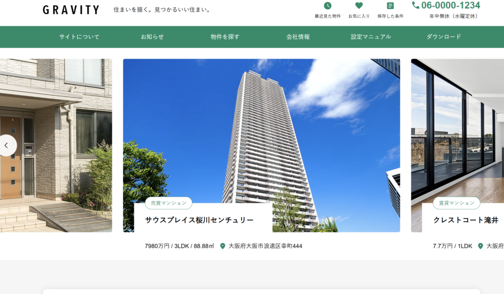 GRAVITY(グラビティー)は、専門知識がなくても高品質な不動産ポータルサイトを、圧倒的なコストパフォーマンスで構築できるWordPressテーマです。