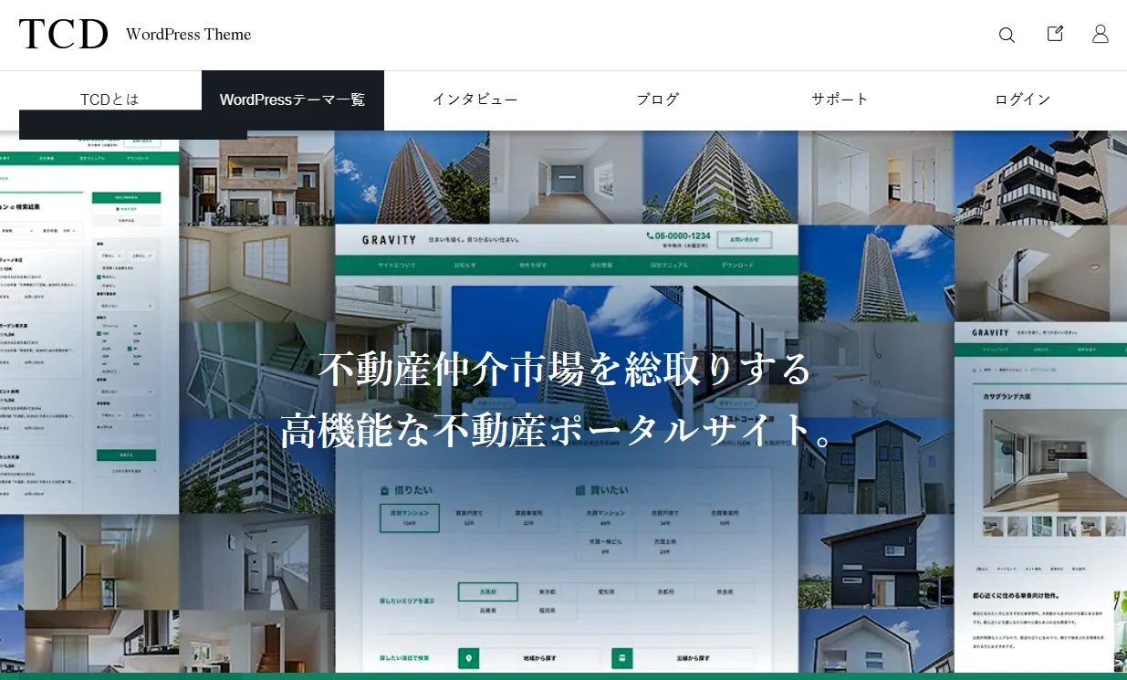 不動産会社がGRAVITYで物件検索サイトを構築する場合、会社のコーポレートサイトは別途用意する必要があります。ただし、TCDでは不動産会社向けのコーポレートサイト用WordPressテーマも別途提供しているため、組み合わせて活用することで、会社全体のWeb戦略を一本化できます。