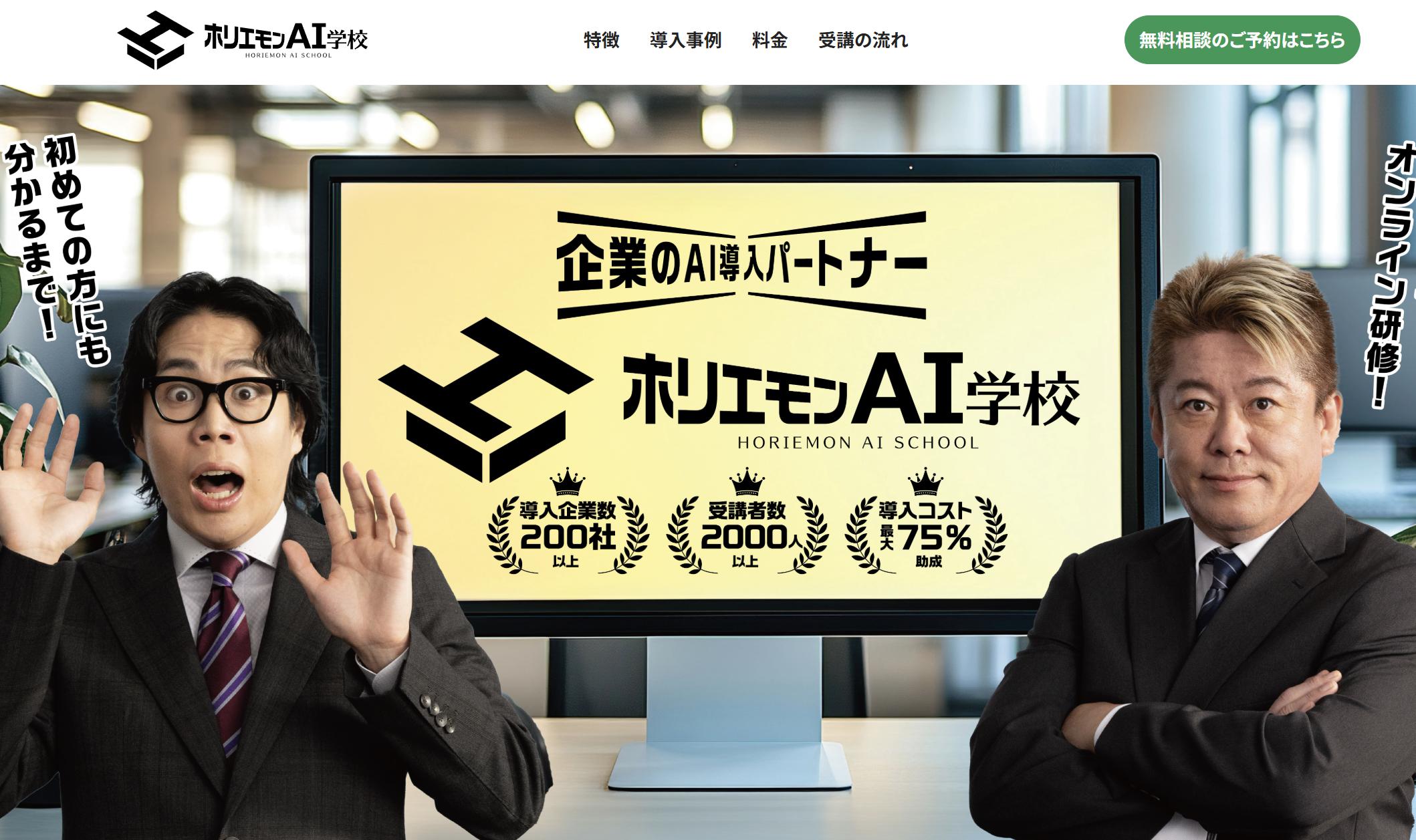 ホリエモンAI学校の法人プランは、堀江貴文氏の共同経営による圧倒的な信頼ブランド・最大75%の人材開発支援助成金・法人専用クローズドチャット・顧問社労士による助成金申請サポート・業務課題から逆算したカスタマイズカリキュラムという複数の要素が揃った法人AI研修サービスです。