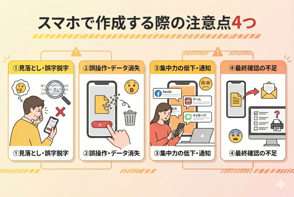 スマホでの職務経歴書作成は手軽で便利ですが、その手軽さゆえに見落としがちなリスクも存在します。せっかく内容にこだわって作成しても、ケアレスミスやデータトラブルで台無しになってしまっては元も子もありません。