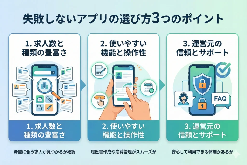 ここでは、自分に合ったアプリを選ぶために押さえておきたい3つのポイントを解説します。