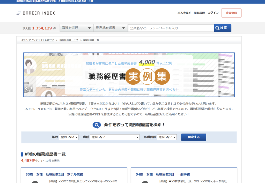 キャリアインデックスの最大の特徴は、年齢・職種・転職回数の3つの条件で検索できる職務経歴書の記入例データベースです。自分と似た経歴を持つ方の書き方を参考にできるため、「こう書けばいいのか」というヒントが具体的に得られます。