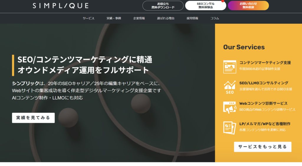株式会社シンプリックは、20年以上のSEO経験をベースに、戦略構築から実践支援まで行うWeb集客支援会社です。「サイトへの流入数を増やすこと」と「流入をコンバージョンに変換させること」にコミットし、クライアントに伴走しつつ高品質なコンテンツ制作を行うことが特徴です。