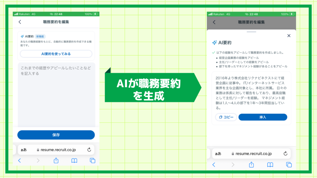 リクナビNEXTではすべて無料で、職務経歴をAIで自動作成でき、スマホでも利用できます。
