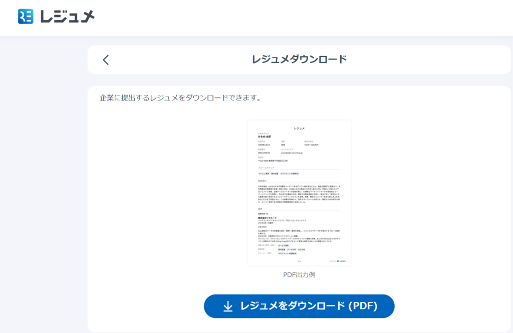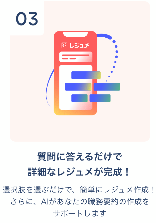 質問に答えるだけでレジュメ(職務経歴書)ができ、+AI機能で職務要約も作ってくれるので、