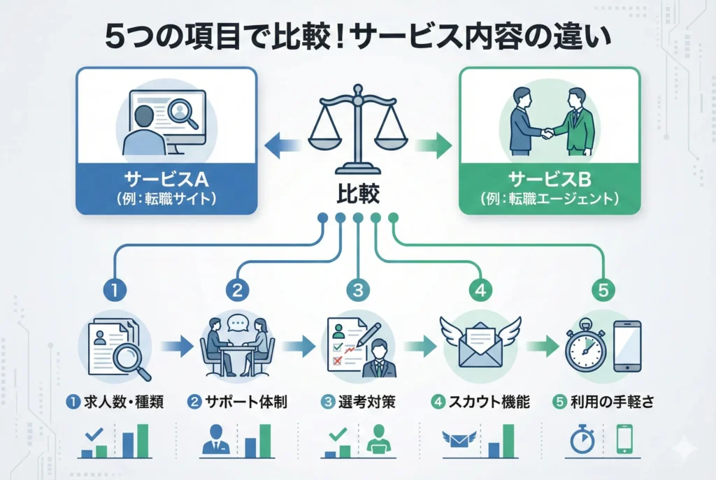 リクナビNEXTとリクルートエージェントは同じリクルートグループのサービスですが、具体的なサービス内容には多くの違いがあります。ここでは「求人数」「サポート体制」「書類添削・面接対策」「スカウト機能」「利用期間」の5つの項目に分けて、両サービスを詳しく比較していきます。