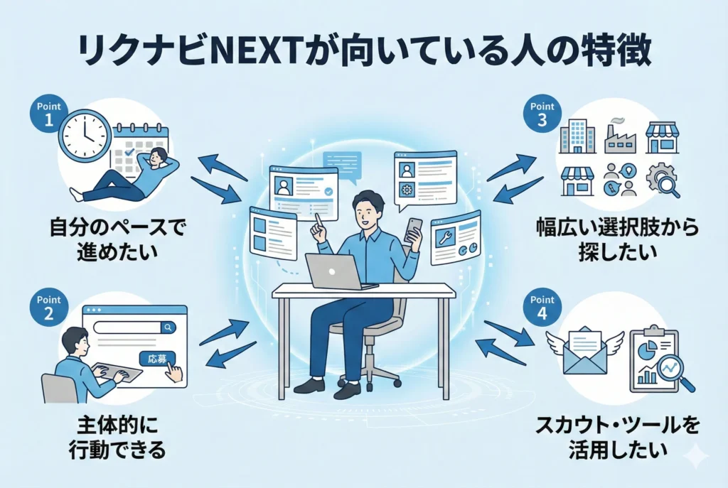ここでは、リクナビNEXTの利用が特に向いている人の特徴を3つ紹介します。自分の転職スタイルと照らし合わせながら確認してみてください。