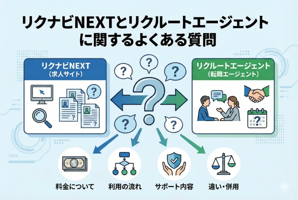 リクナビNEXTとリクルートエージェントの違いを理解しても、実際に利用する段階になると細かな疑問が出てくるものです。ここでは、両サービスについて多くの方が気になるポイントをQ&A形式でまとめました。