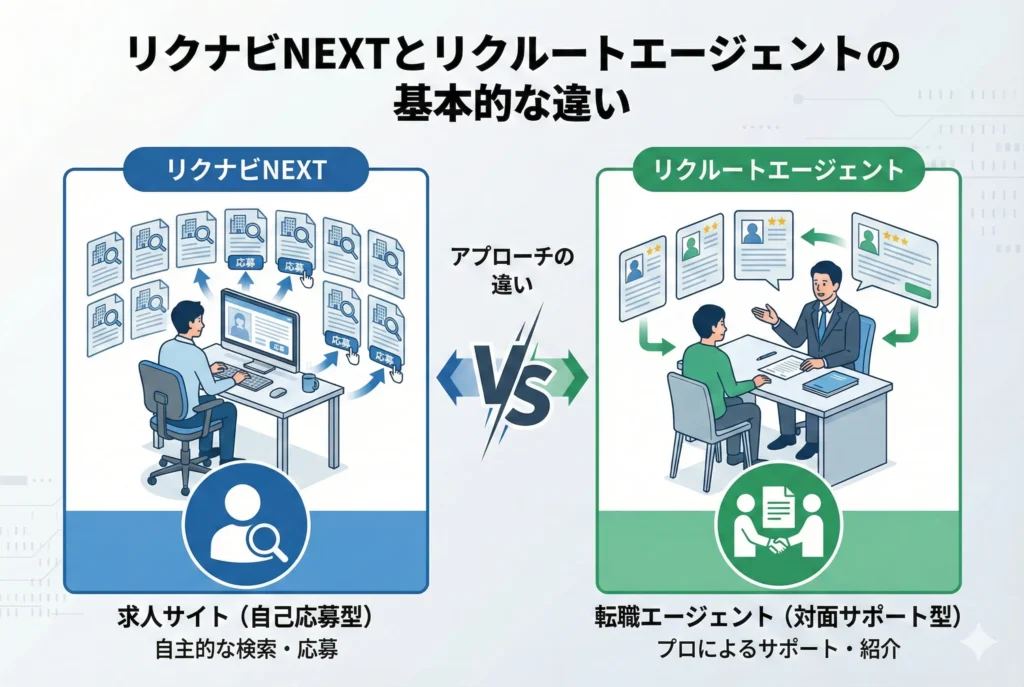 ひと言でいえば、リクナビNEXTは「自分で求人を探して応募する転職サイト」、リクルートエージェントは「専任の担当者と二人三脚で転職を進める転職エージェント」です。
