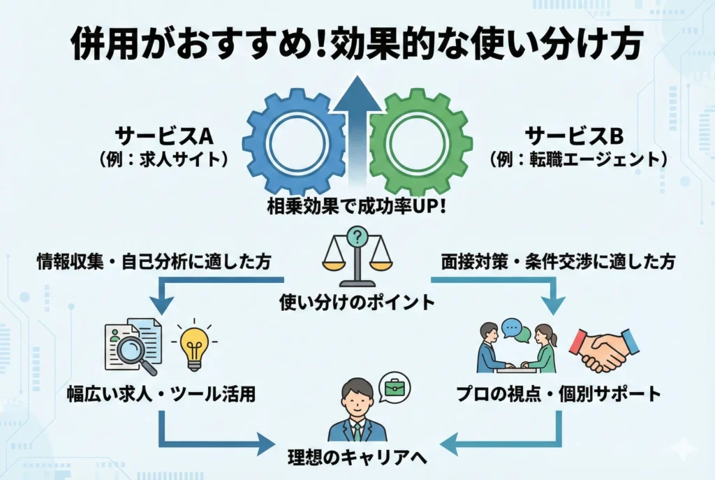 ここまでリクナビNEXTとリクルートエージェントの違いを解説してきましたが、実はどちらか一方だけを使うよりも、両方を併用するのが最も効果的な転職活動の進め方です。