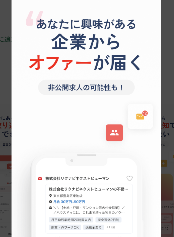 アプリでは、希望条件に合致した新着求人が掲載されたタイミングや、企業からオファーが届いたタイミングでスマホに通知が届きます。メールで通知を受ける場合と違い、ロック画面にそのまま表示されるため、他のメールに埋もれて見逃すリスクが大幅に減ります。