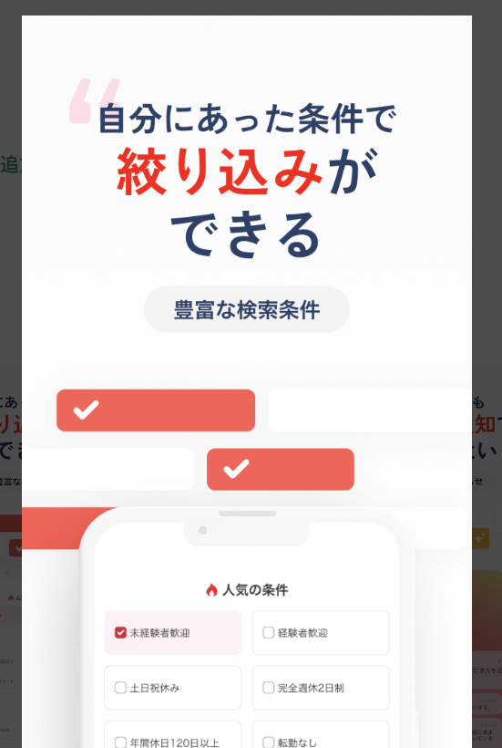 さらに、検索条件の自由度の高さもアプリならではのメリットです。「土日祝休み」「転勤なし」「第二新卒歓迎」「フリーターから正社員を目指す」など、ライフスタイルやキャリアの状況に合わせた多彩なこだわり条件で絞り込みができます。条件が自動保存されるアプリの特性を活かせば、毎日数分のチェックだけで自分にぴったりの求人を効率よく見つけられるでしょう。