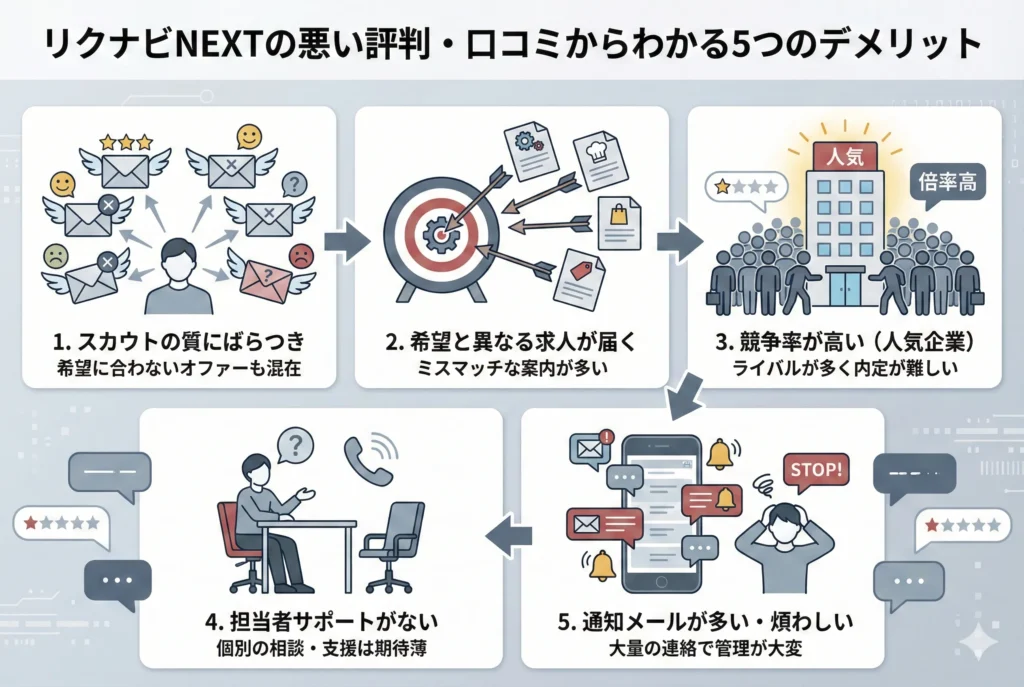 リクナビNEXTは多くの転職者に支持されている一方で、実際の利用者からはネガティブな声も寄せられています。ここでは、口コミから浮かび上がった5つのデメリットを正直にお伝えします。事前に把握しておくことで、リクナビNEXTをより上手に活用できるはずです。