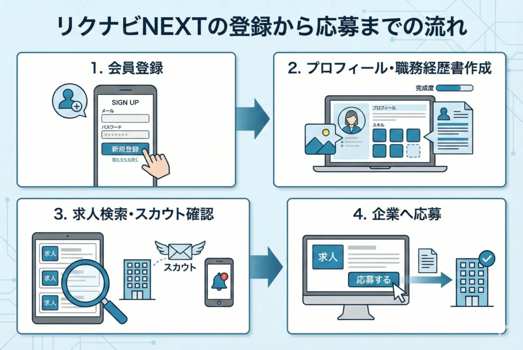 レジュメの準備が整ったら、いよいよ求人を探して応募に進みます。リクナビNEXTでの求人検索から選考開始までの流れは、大きく4つのステップに分けられます。