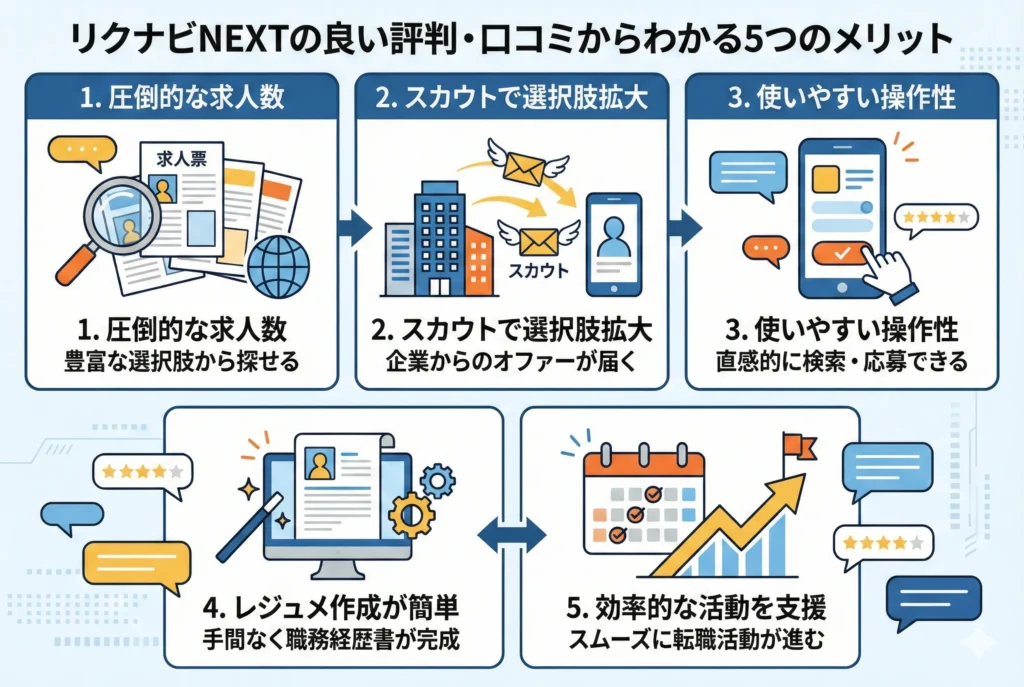 リクナビNEXTは国内最大級の転職サイトとして、多くの転職者から高い評価を得ています。ここでは、実際の利用者の口コミや評判から見えてきた5つのメリットを詳しく解説します。これからリクナビNEXTの利用を検討している方は、ぜひ参考にしてください。