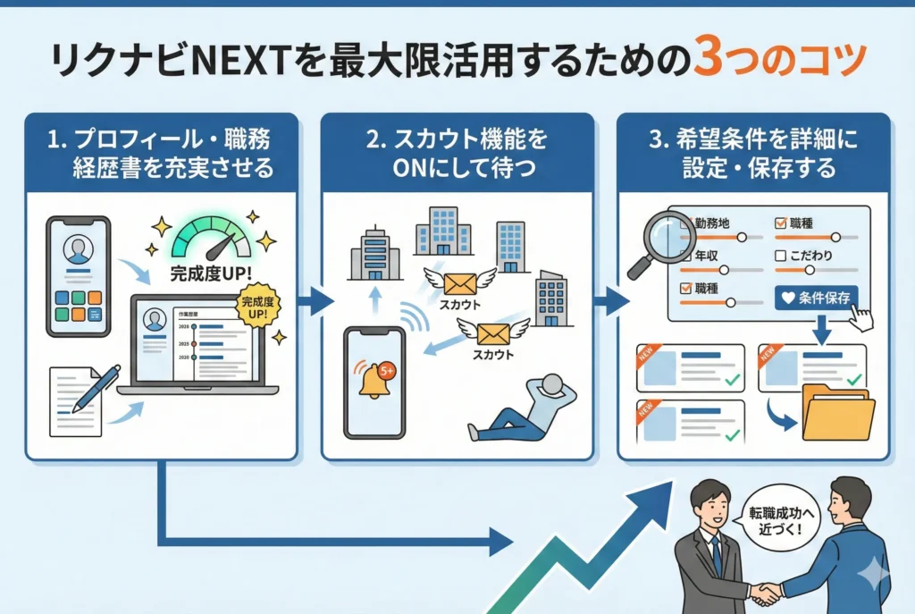 リクナビNEXTに登録しただけで満足してしまっては、せっかくのサービスを使いこなせているとは言えません。同じサイトを使っていても、活用の仕方次第で転職活動の成果には大きな差が生まれます。ここでは、リクナビNEXTのポテンシャルを最大限引き出すための3つの実践的なコツをご紹介します。