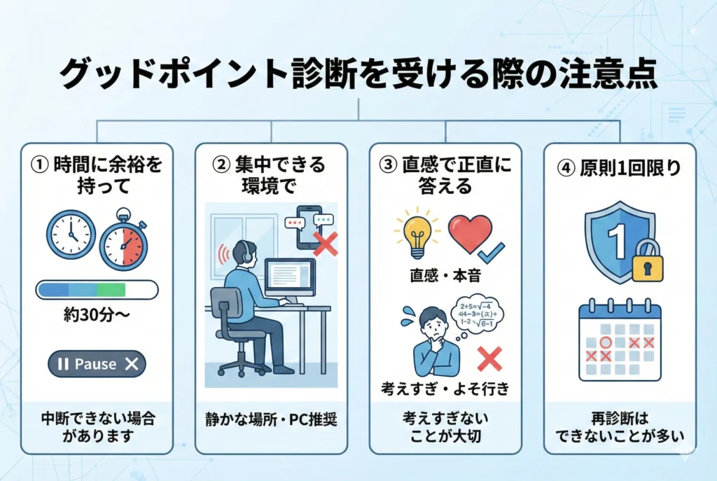 グッドポイント診断で正確な結果を得るための最も重要なポイントは、質問に対して素直に、直感的に回答することです。診断は3部構成で制限時間が設けられており、1問ずつじっくり考え込んでいると時間が足りなくなる可能性があります。