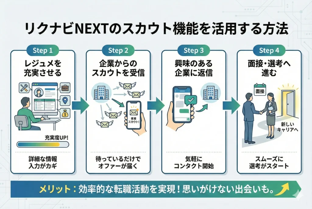リクナビNEXTで書類選考になかなか通過できない方にぜひ活用してほしいのが、スカウト機能です。自分から応募するだけでなく、企業側からアプローチを受けることで、書類選考の通過率を大幅に高められる可能性があります。