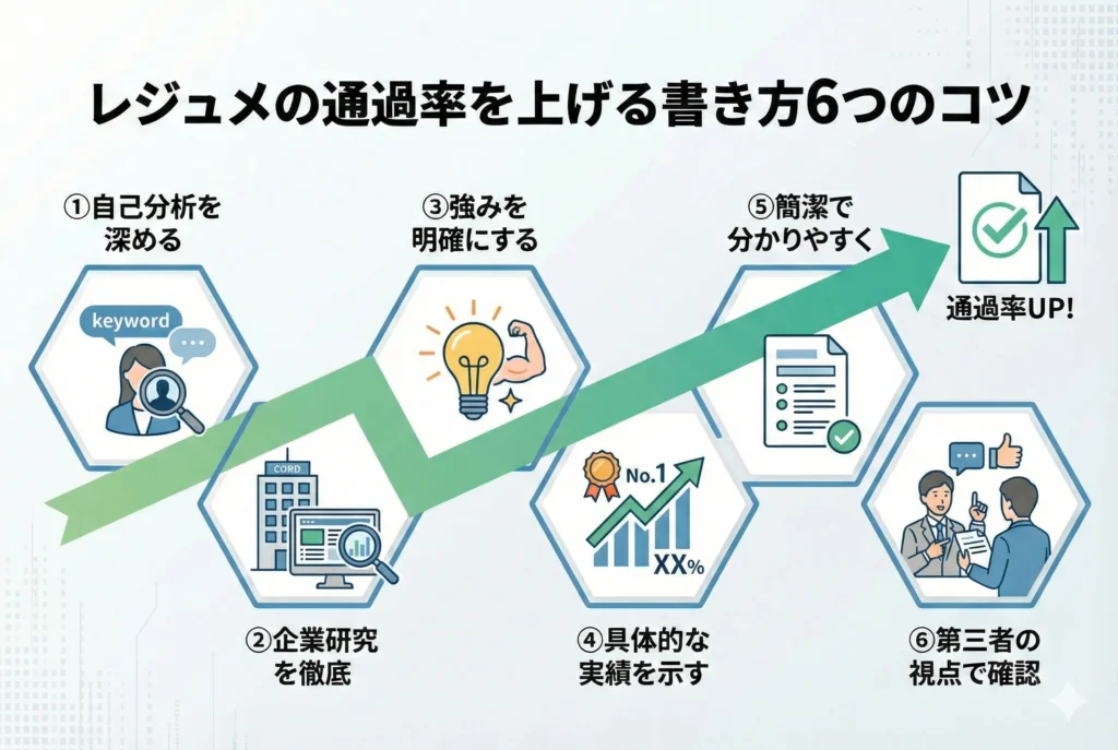 ここでは、採用担当者に「この人に会ってみたい」と思わせるレジュメを作るための6つの実践的なコツを紹介します。