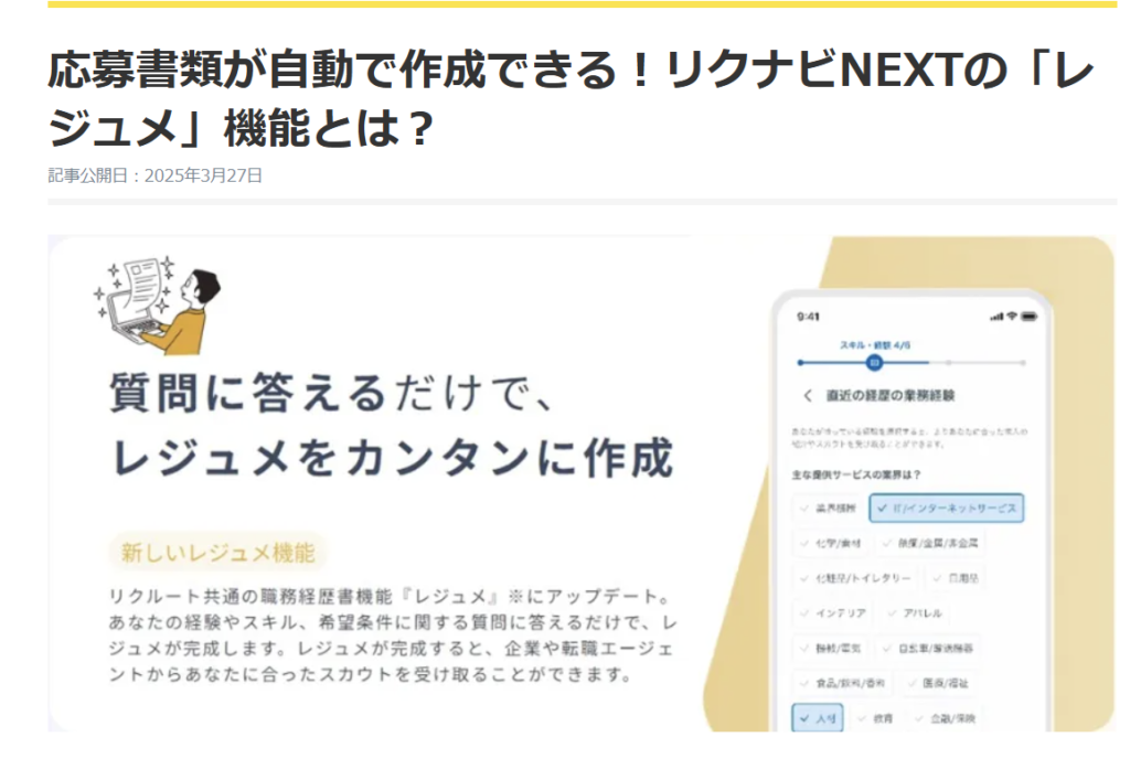 リクナビNEXTには、登録した情報をもとに履歴書・職務経歴書を自動で生成できる「レジュメ」機能があります。キーワードを選ぶだけで応募書類が作成でき、AIが職務要約の自動作成もサポートします。