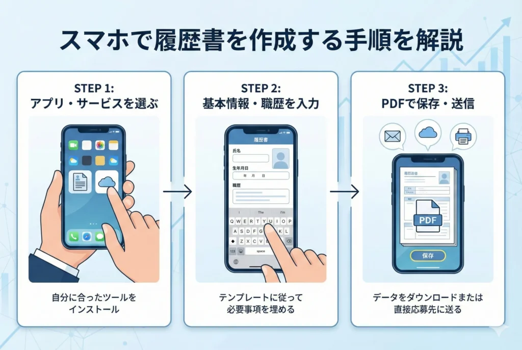 おすすめのアプリやサービスがわかったところで、実際にスマホで履歴書を作成する流れを見ていきましょう。ここでは、アプリのインストールから提出までの一連の手順を5つのステップに分けて解説します。初めてスマホで履歴書を作る方でも迷わず進められるよう、各ステップのポイントもあわせて紹介します。