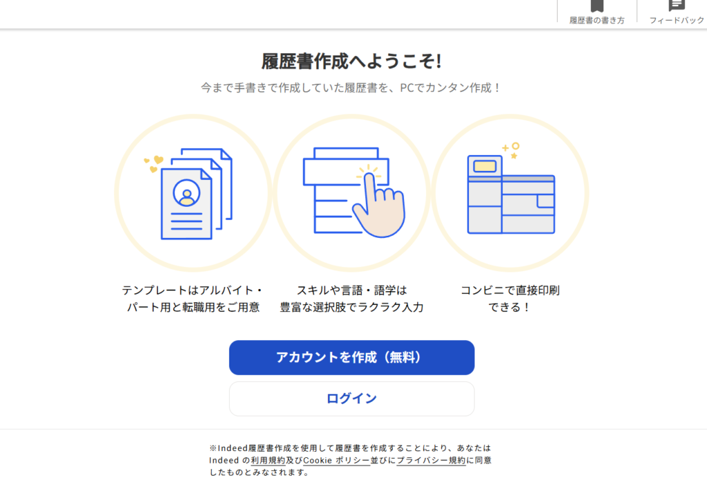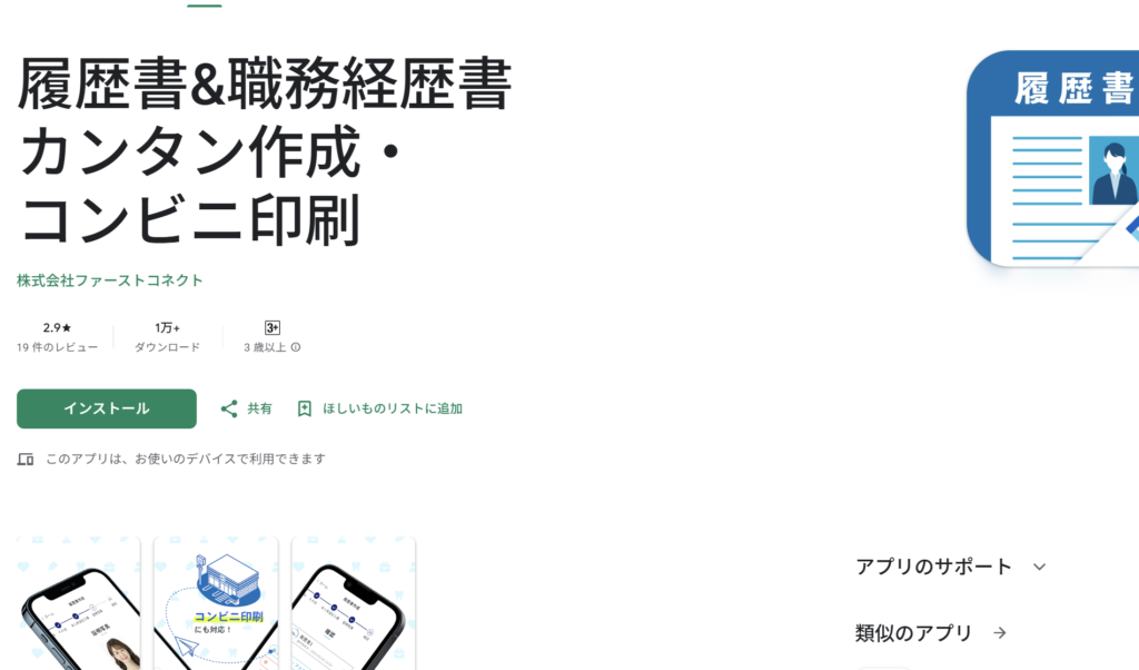 | 作成できる書類 | 履歴書(バイト/資格/自己PR用3種)、職務経歴書。 |