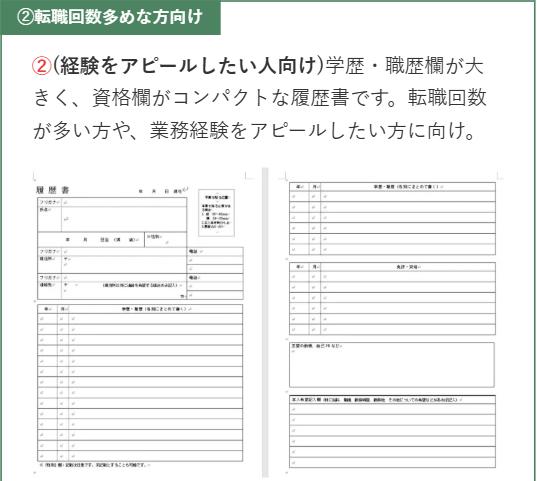 (経験をアピールしたい人向け)学歴・職歴欄が大きく、資格欄がコンパクトな履歴書です。転職回数が多い方や、業務経験をアピールしたい方に向け。