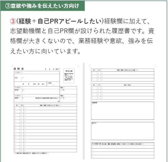(異業種/職種に転職したい)資格欄、志望動機、自己PR欄にゆとりがある履歴書です。複数の資格・検定を持っている方や、異業種・異職種転職を実現したい方に向いています。