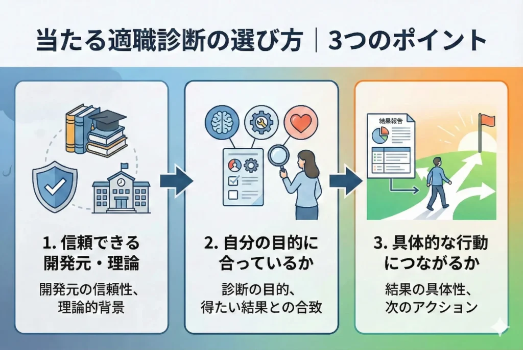 せっかく時間をかけて診断するなら、納得感のある結果を得たいものです。ここでは、当たる適職診断を見極めるための3つの選び方を解説します。