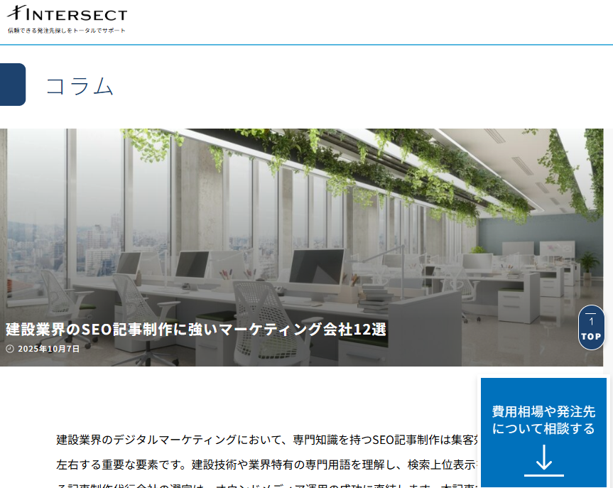 「建設業界のSEO記事制作に強いマーケティング会社12選」です。建設業界特有のキーワード戦略やローカルSEO対策に精通した記事制作会社として弊社が選出されています。