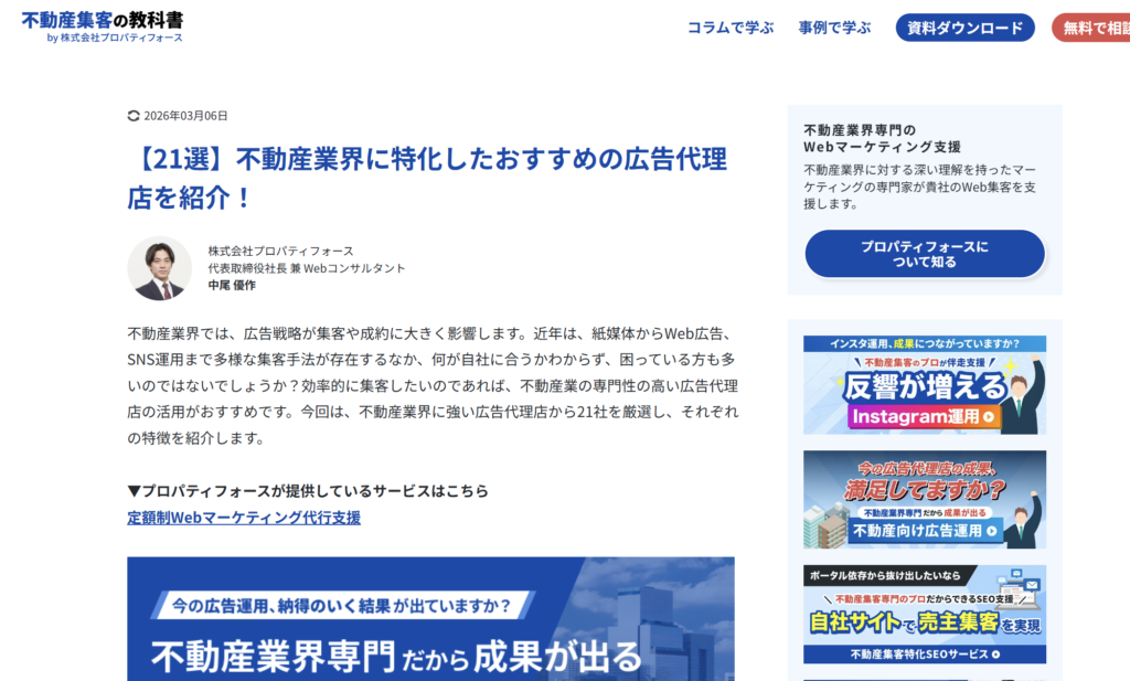 本メディアを運営されている株式会社プロパティフォースは、不動産業界に特化したデジタルマーケティング支援やSaaSの提供、コンサルティングを展開されているプロフェッショナル集団です。