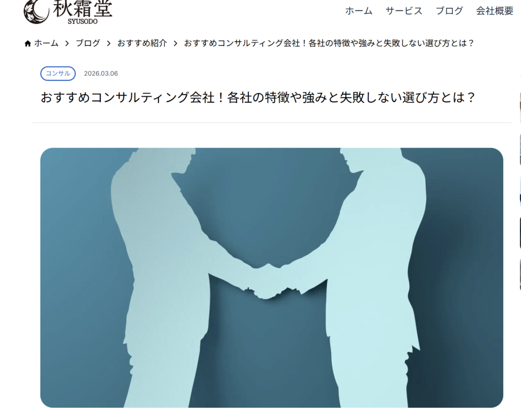 この度、秋霜堂株式会社が運営するビジネスメディアにて、弊社を「おすすめコンサルティング会社」の一社として選出・掲載いただきました。